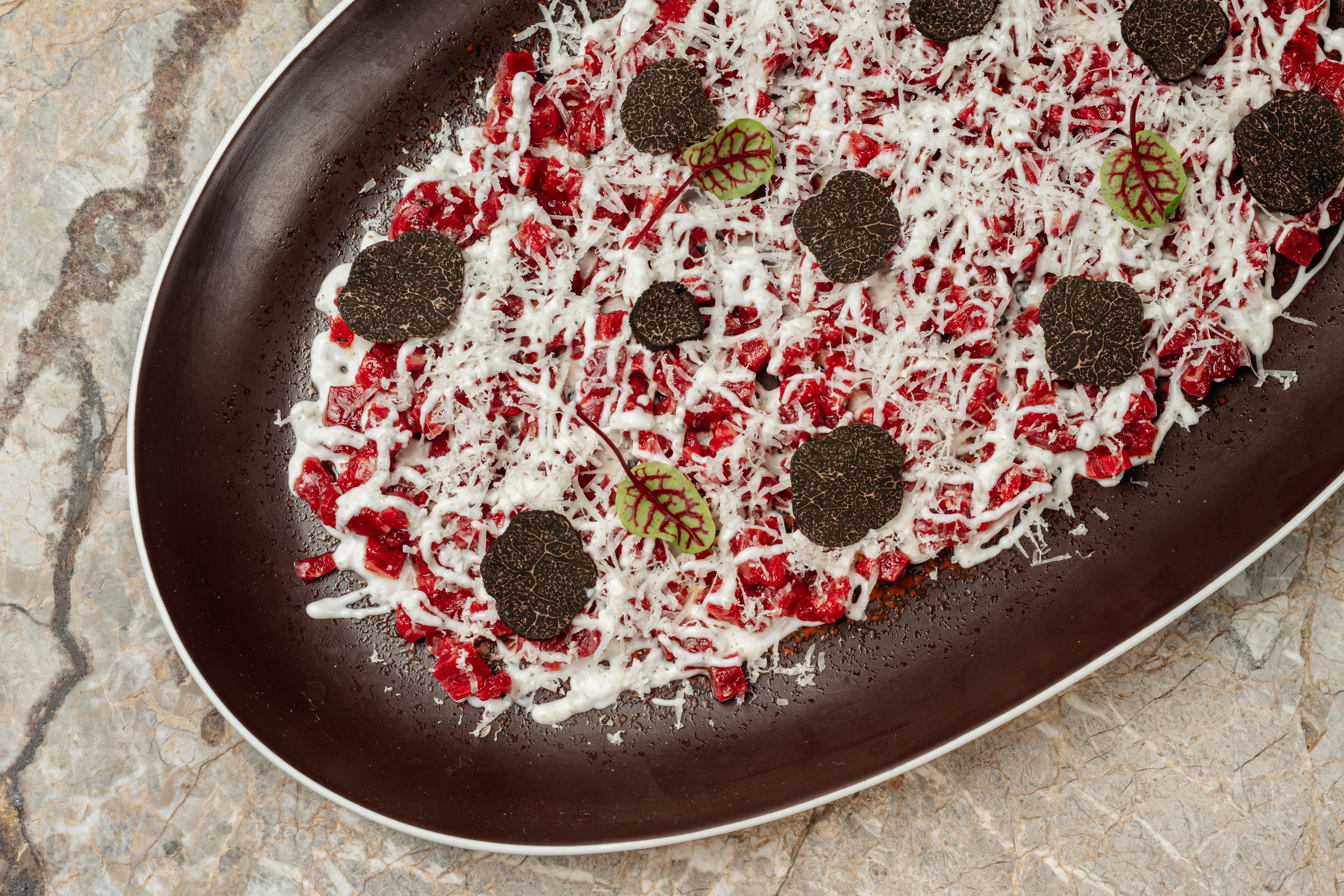 Кухню возглавил бренд-шеф Мидо Мустафа, предлагая европейскую основу с деликатными азиатскими нотками и акцентом на качество продукта. Меню выстроено вокруг понятной гастрономической классики: от тартаров и вителло тоннато до домашней пасты, ризотто и выразительных горячих блюд, где европейские техники встречаются с восточными нюансами. Десертная карта и бар продолжают эту линию — от тирамису и шоколадного фондана до авторских коктейлей и продуманной винной коллекции с акцентом на Европу.