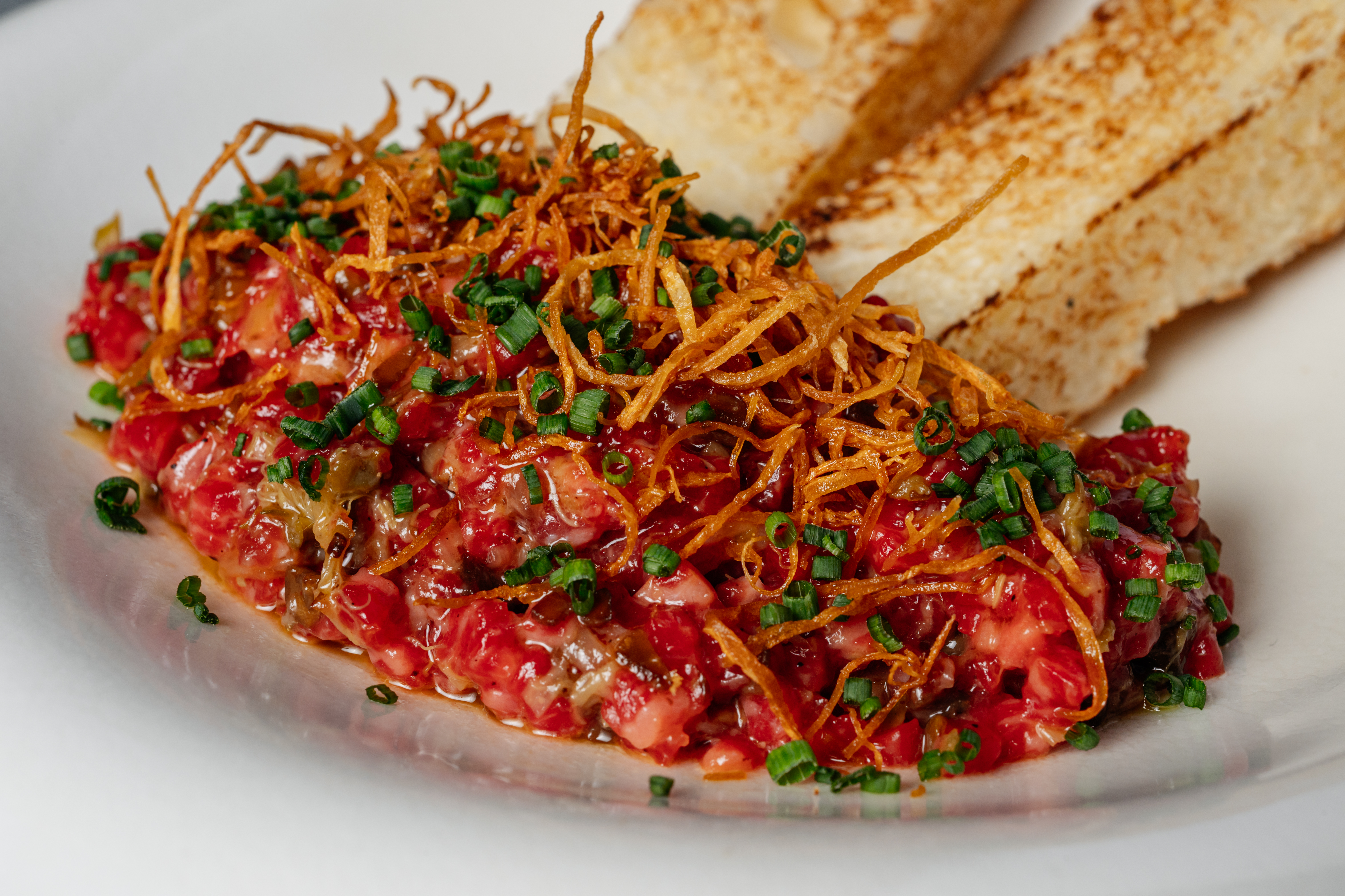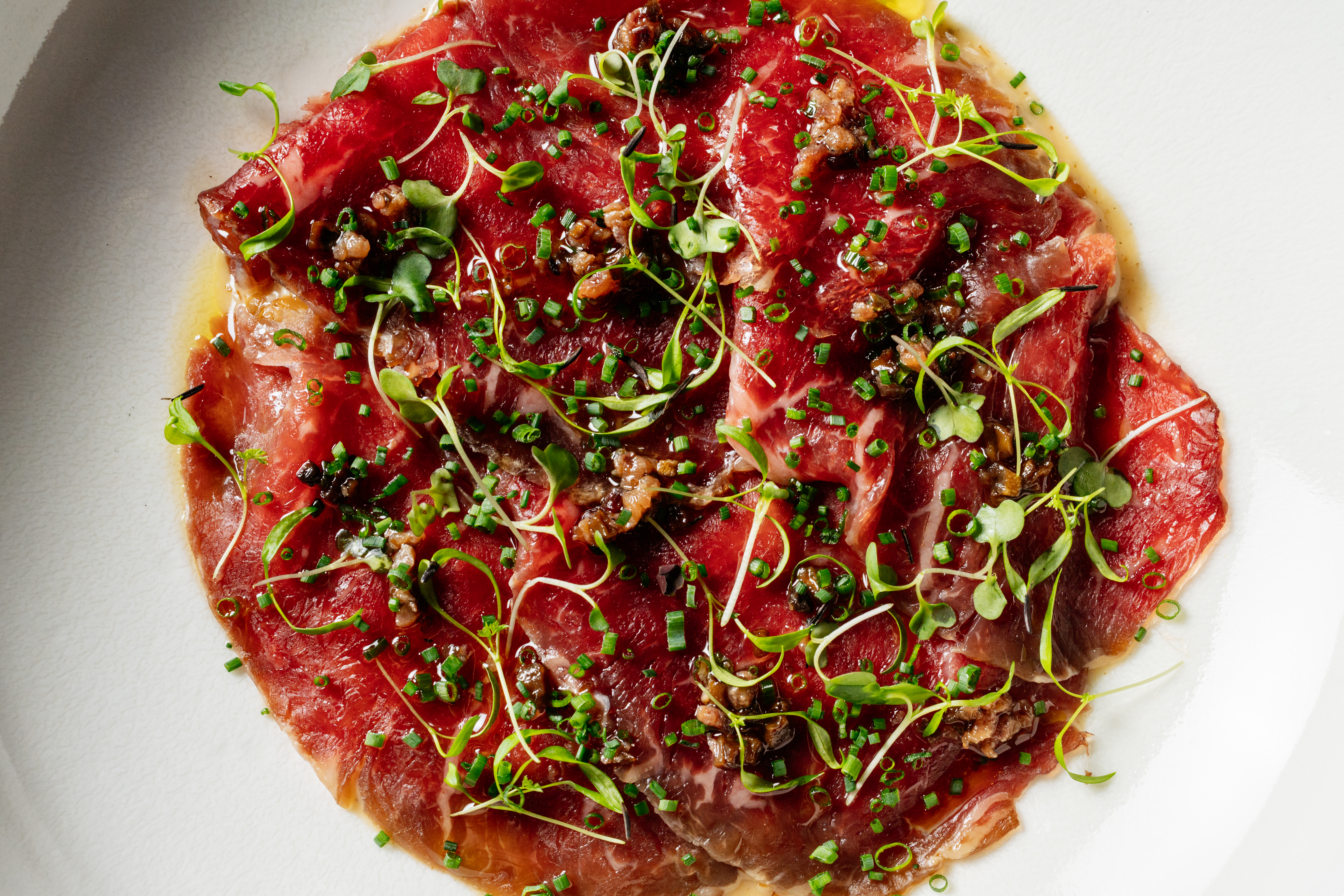 - тартар из говядины с соленым желтком и луком-пореем