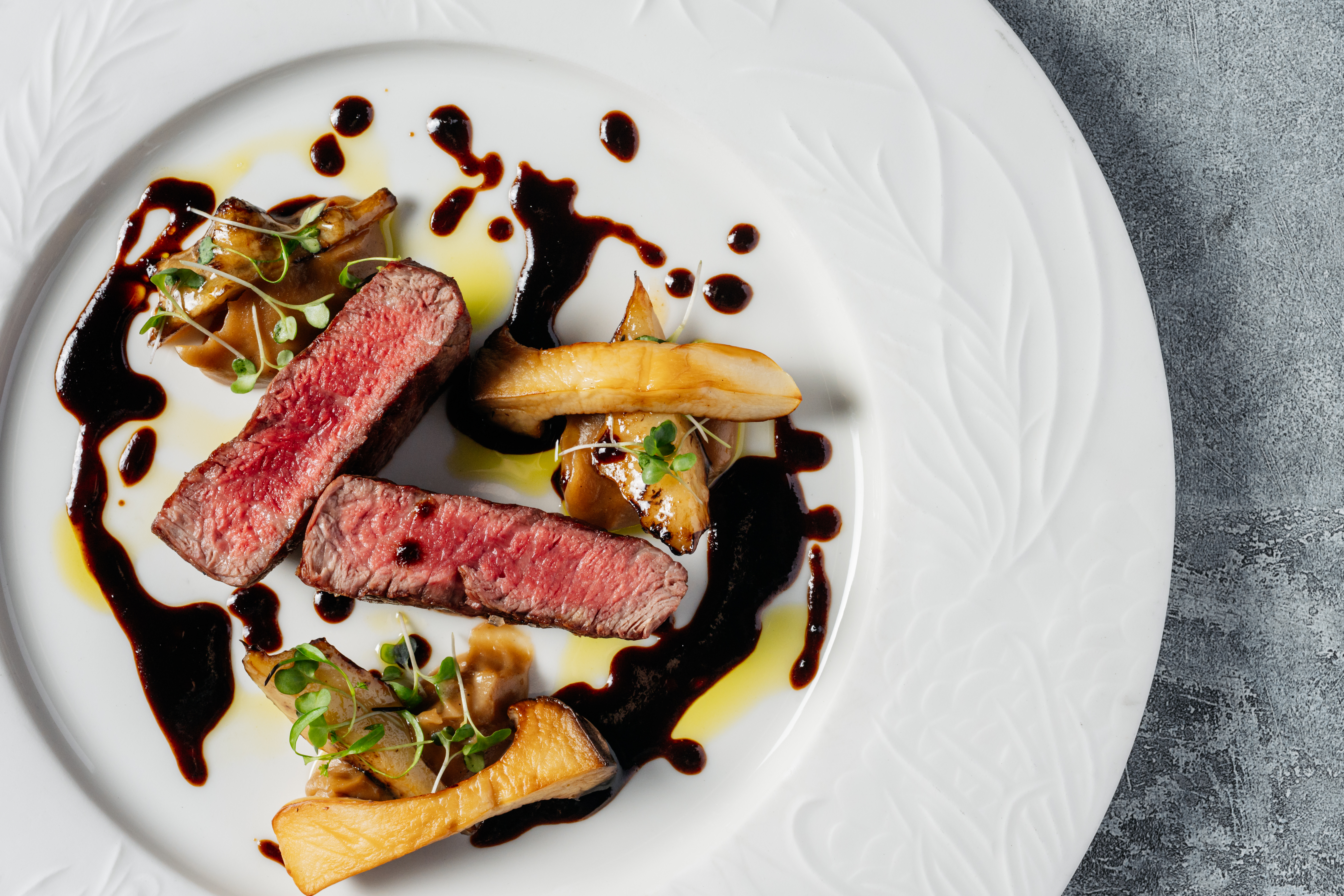 Совместная работа шефов — это встреча двух сильных авторских почерков, объединенных продуктом бескомпромиссного качества. В основе — мясо сухого вызревания, существующего в благородной плесени, где оно постепенно наполняется сложным ароматическим профилем: оттенками вкуса лесного ореха, сливочного масла, сыра и легкой минеральной глубины. Такая выдержка делает текстуру плотной и упругой, а вкус — объемным, долгим и запоминающимся.