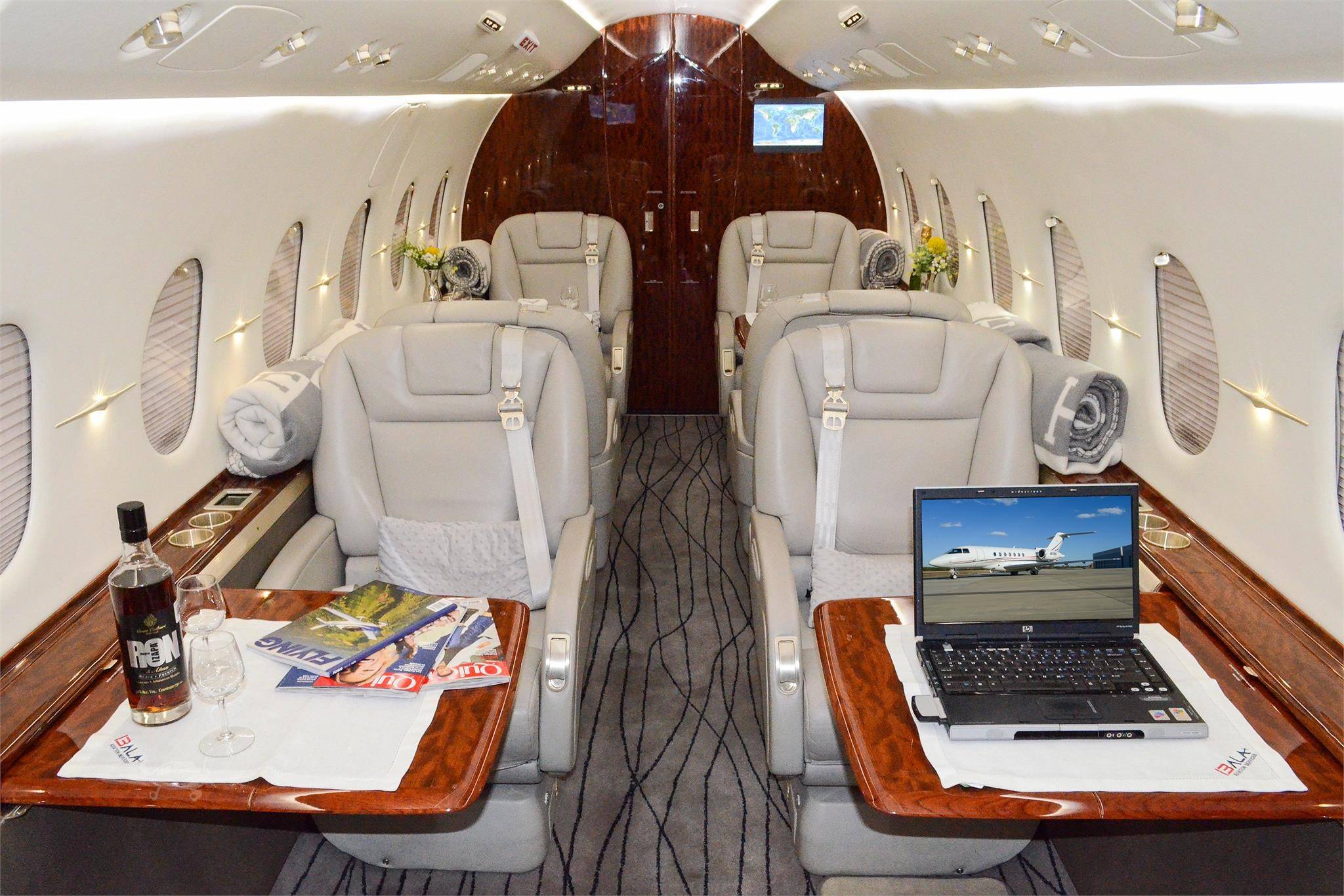 Салон стандартной конфигурации вмещает 8 пассажиров, в корпоративной версии число кресел может быть увеличено до 12. В салоне есть вместительный гардероб, отлично оборудованная кухня и туалетная комната. Кроме того, на борту воздушного судна предусмотрено место для багажного отделения объемом 2,52 куб. м. Во время полета доступ к багажу осуществляется через пассажирский салон, а для его загрузки или выгрузки на земле используется дополнительная внешняя дверь.