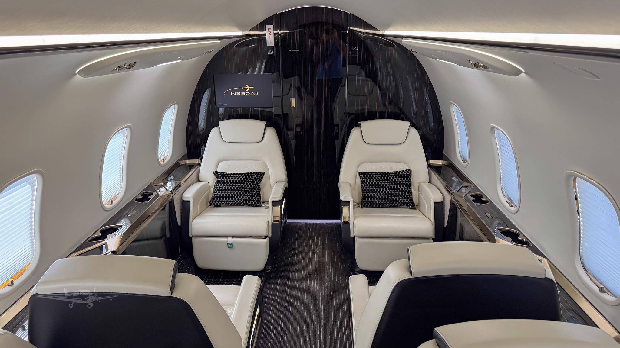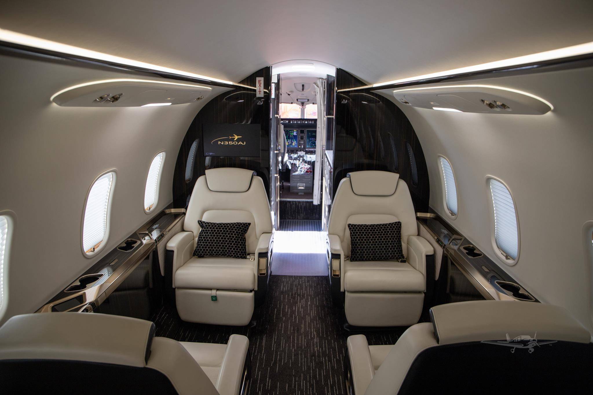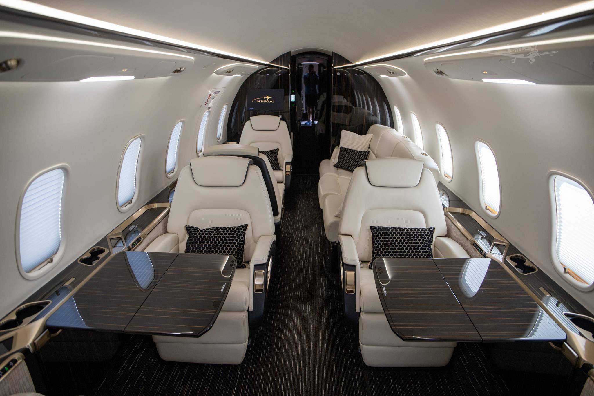 Салон Challenger 350 просторнее, чем у близкого по дальности полета Legacy 500 и высокоскоростного Citation X. Его площадь составляет порядка 13,6 м2, а высота потолка (185 см) позволяет пассажирам стоять в полный рост.