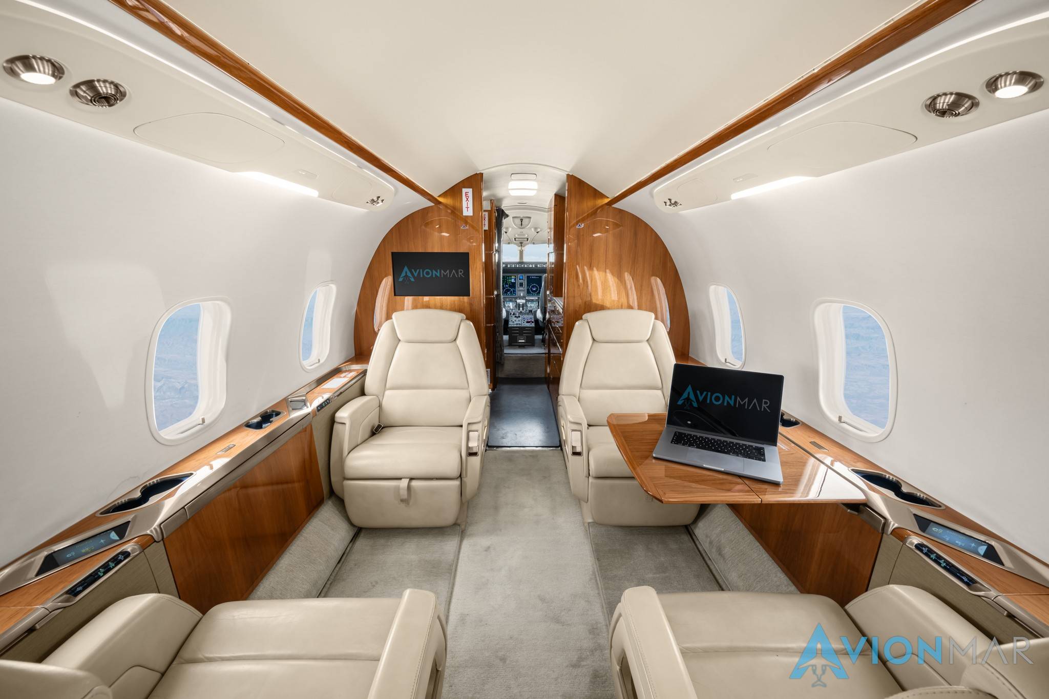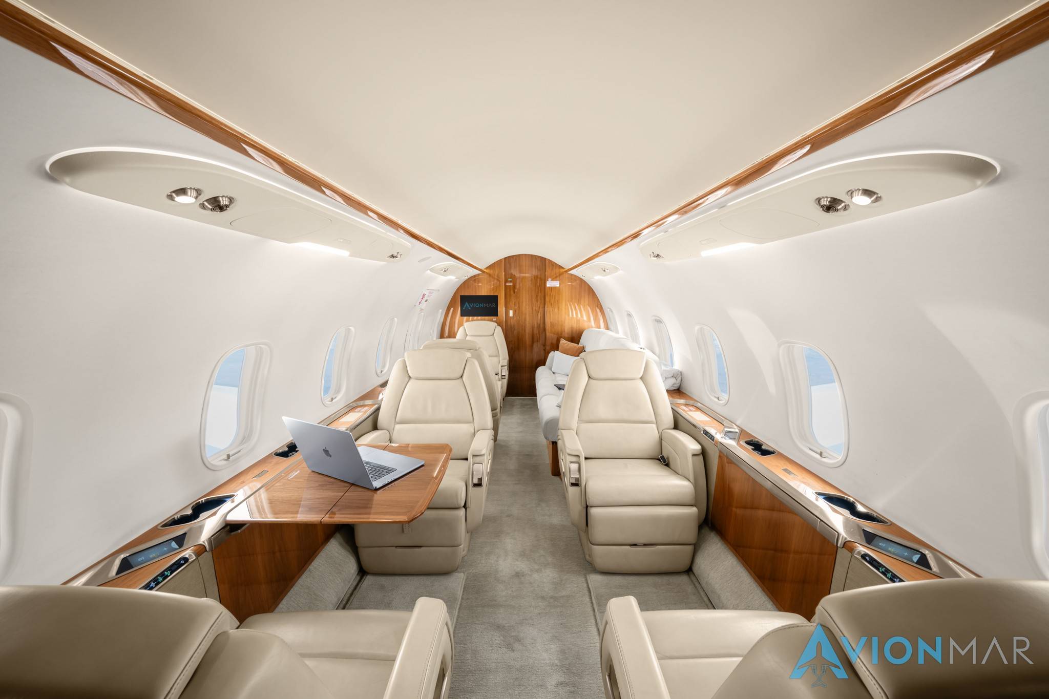 Система управления функциями салона обновлена — теперь настройками можно управлять на сенсорных панелях или прямо со своего смартфона. Большие и удобные кресла при необходимости раскладываются в спальные места. Между ними остается достаточно широкий проход.