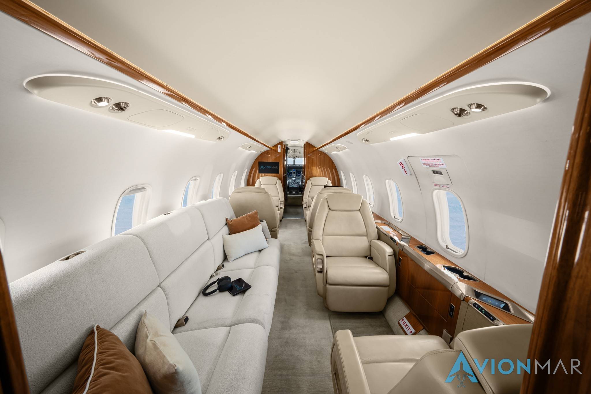 Салон Challenger 350 просторнее, чем у близкого по дальности полета Legacy 500 и высокоскоростного Citation X. Его площадь составляет порядка 13,6 м2, а высота потолка (185 см) позволяет пассажирам стоять в полный рост.