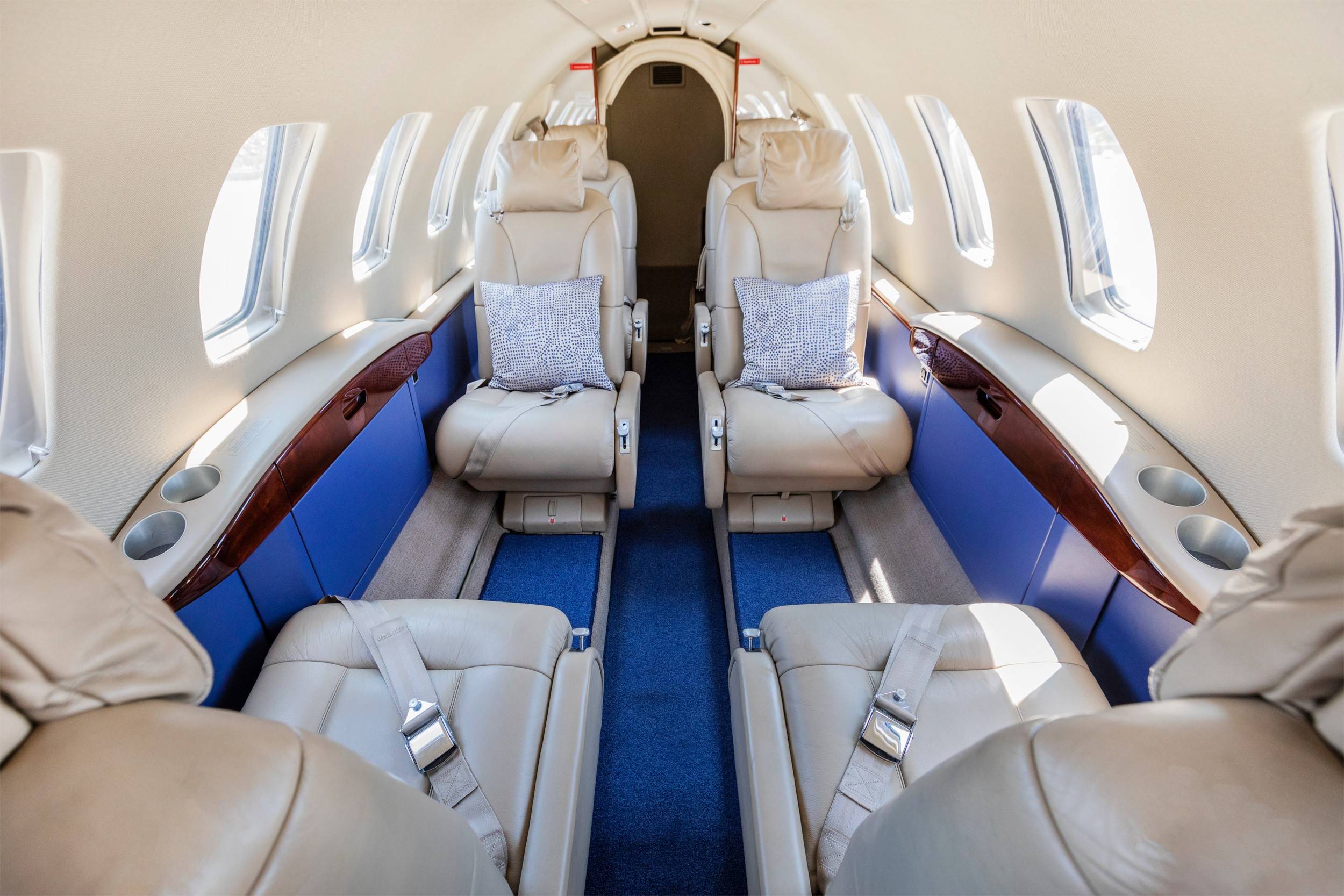 Просторная, хорошо освещенная каюта CJ2+ (длиннее чем кабина CJ1+ на 0.91 м) с передовой системой звукоизоляции, выполнена в новом стиле с использованием более дорогих и высококачественных материалов для отделки, ровный пол имеет углубление для удобного прохода и размещения пассажиров. В салоне самолета расположены 6 кресел, четыре из которых напротив друг-друга, удобные столики могут аккуратно складываться в боковые стенки салона, когда вы готовы отложить работу и отдохнуть. Citation CJ2+ имеет типичную компоновку малых бизнес-джетов, в салоне есть только самое необходимое для непродолжительного рейса, небольшая туалетная комната и гардероб расположены в задней части салона, багажное отделение находиться в хвостовой части самолета и не доступно из салона во время полета.
