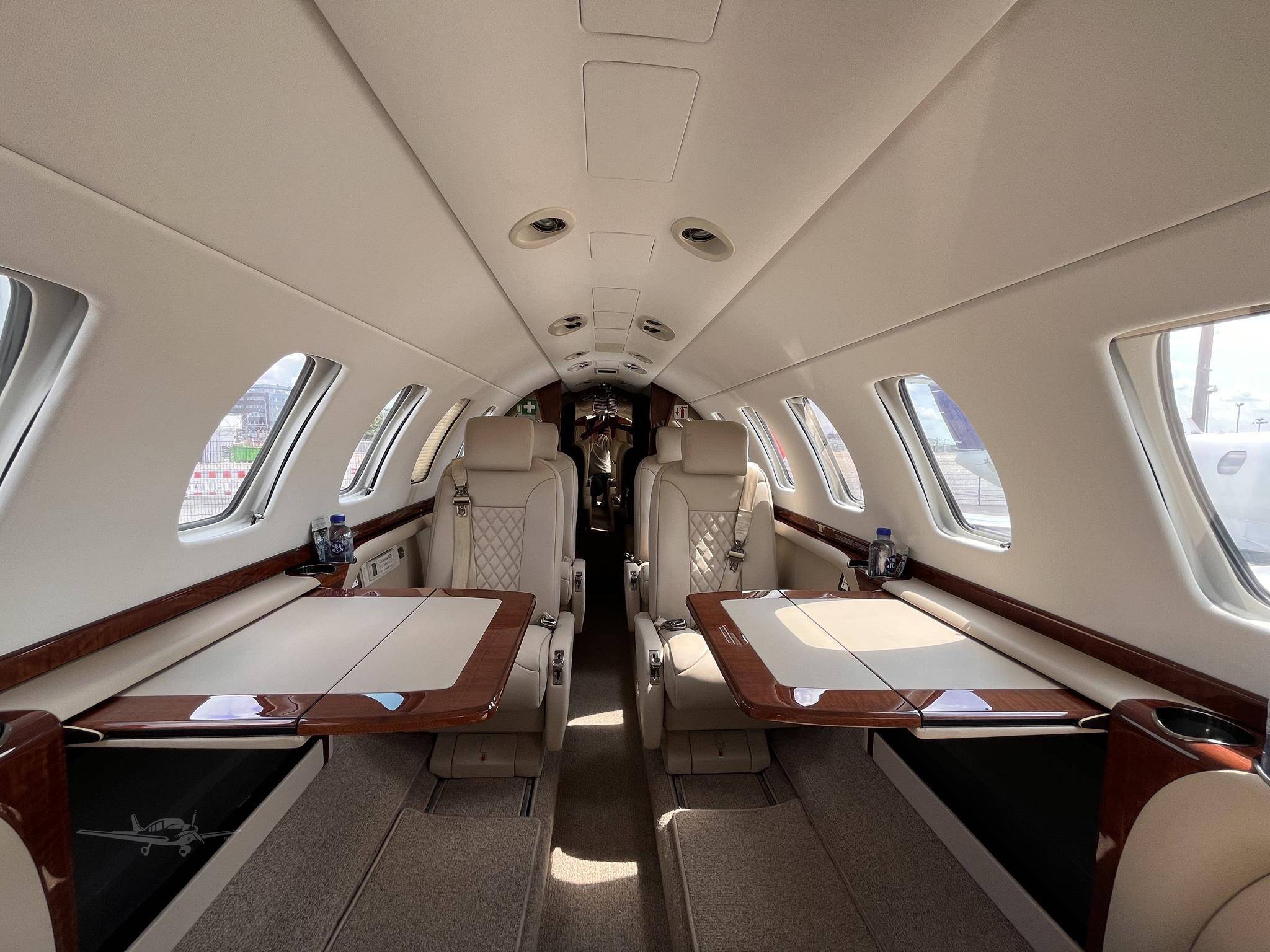 В сущности, относительно других моделей CJ изменяется только длина салона, которая у CJ3 на 64 см больше, чем у CJ2+, и на 50 см меньше, чем у CJ4. Что же касается оснащения, то здесь все почти в точности повторяет интерьеры джетов этой линейки. До шести пассажиров размещаются в салоне с сечением 1,47 на 1,45 м, но по сравнению с CJ2+ у них остается больше пространства для ног, чуть лучше здесь оборудован бар, а в хвосте чуть больше места для багажа — там же, где и располагается небольшой туалет, который отгораживается занавеской. Новая концепция дизайна салона Cessna и система управления Clairity на моделях CJ пока не появились.