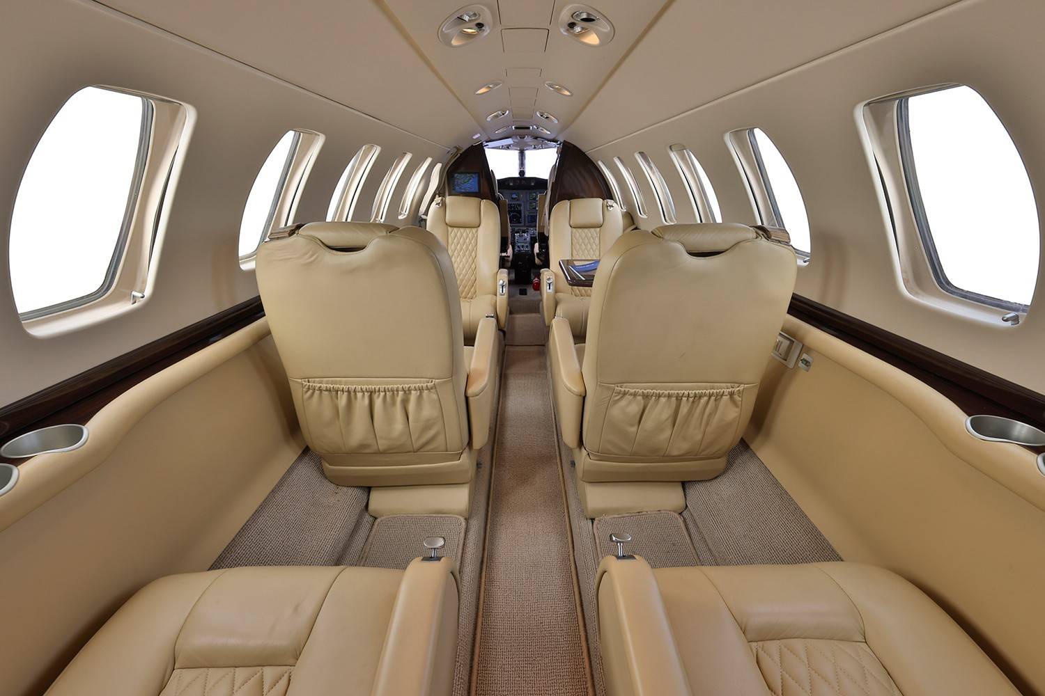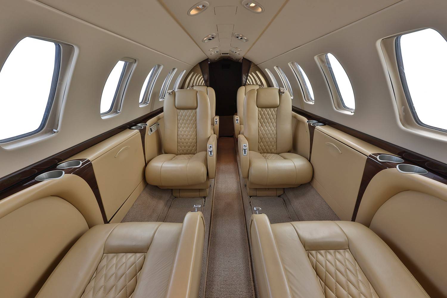 В сущности, относительно других моделей CJ изменяется только длина салона, которая у CJ3 на 64 см больше, чем у CJ2+, и на 50 см меньше, чем у CJ4. Что же касается оснащения, то здесь все почти в точности повторяет интерьеры джетов этой линейки. До шести пассажиров размещаются в салоне с сечением 1,47 на 1,45 м, но по сравнению с CJ2+ у них остается больше пространства для ног, чуть лучше здесь оборудован бар, а в хвосте чуть больше места для багажа — там же, где и располагается небольшой туалет, который отгораживается занавеской. Новая концепция дизайна салона Cessna и система управления Clairity на моделях CJ пока не появились.