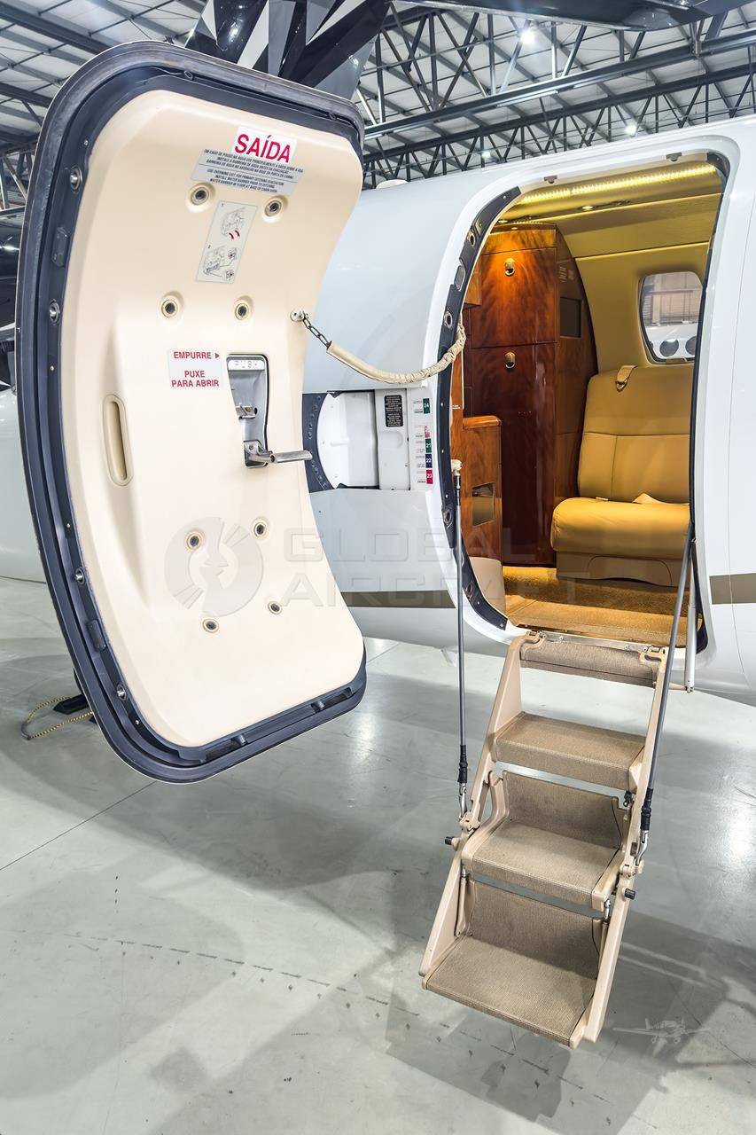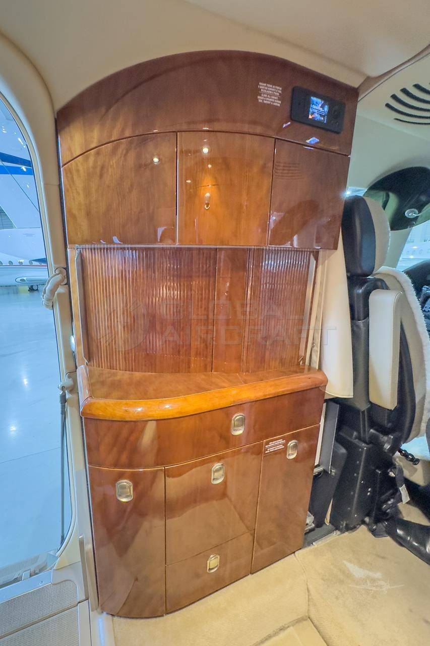 Небольшая бортовая кухня находится рядом со входом в самолет, напротив дивана. Туалетная комната, расположенная в задней части самолета, делит пространство с гардеробом. Изолированное багажное отделение находится в хвостовой части и недоступно из салона.