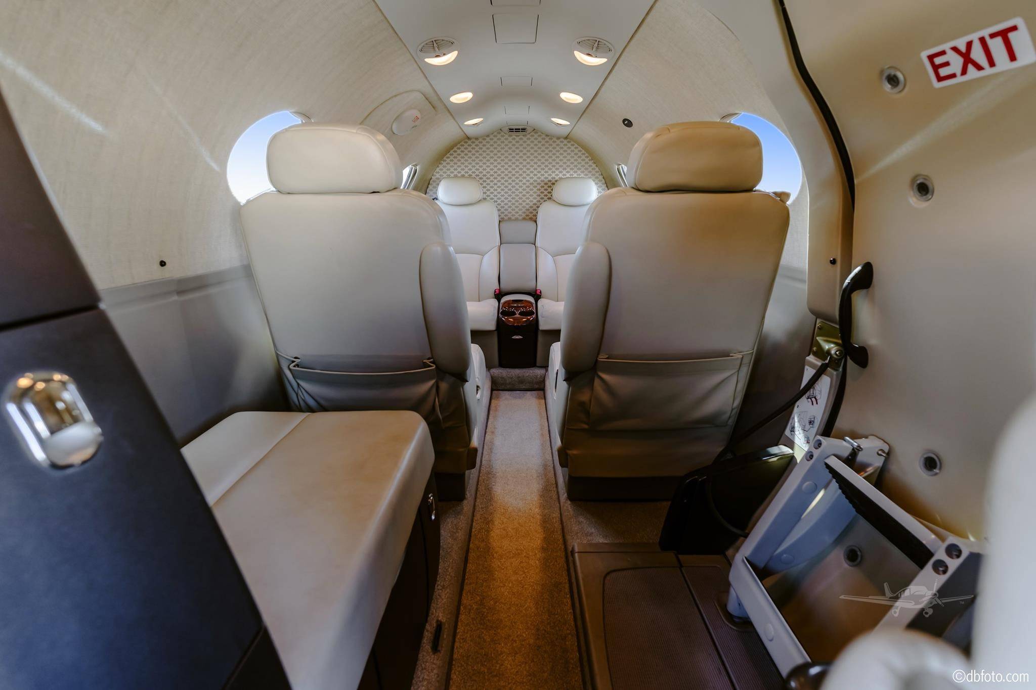 Представьте себе летающий бизнес-седан — и у вас будет некоторое представление о салоне Cessna Mustang. Лаконичный и функциональный интерьер бизнес-джета подходит и для деловых переговоров, и для отдыха. На борту Mustang есть все необходимое для непродолжительных перелетов. Здесь размещается максимум пять пассажирских кресел, одно из которых расположено за кабиной пилотов и совмещено с функцией биотуалета. В идеале, летают вчетвером, а еще один пассажир может занять место второго пилота, так как самолет сертифицирован для управления одним.