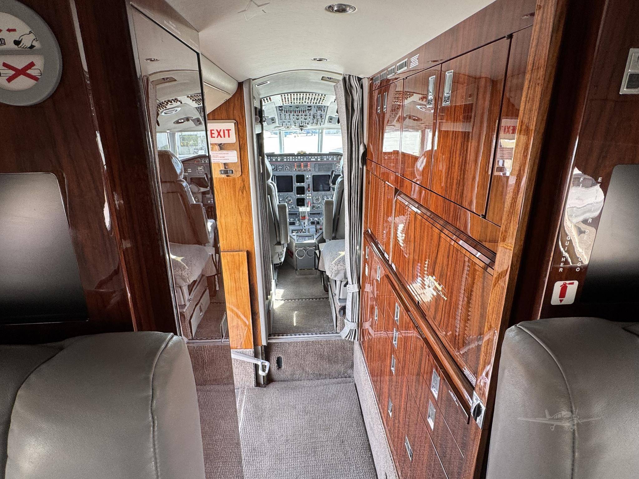 Falcon 900EX имеет широкий просторный салон с великолепной отделкой и современной электроникой на борту. Салон разделен на две изолированные части, что создает условия для уединения в целях сосредоточенной работы или спокойного отдыха. Служебные помещения включают бортовую кухню, туалетные комнаты и просторное багажное отделение в хвостовой части самолета, которое доступно во время полета. Кресла трансформируется в полноценное спальное место. В полете к услугам пассажиров - спутниковый телефон, DVD-плеер, CD-проигрыватель, LCD-мониторы, система Airshow, офисное и развлекательное оборудование.