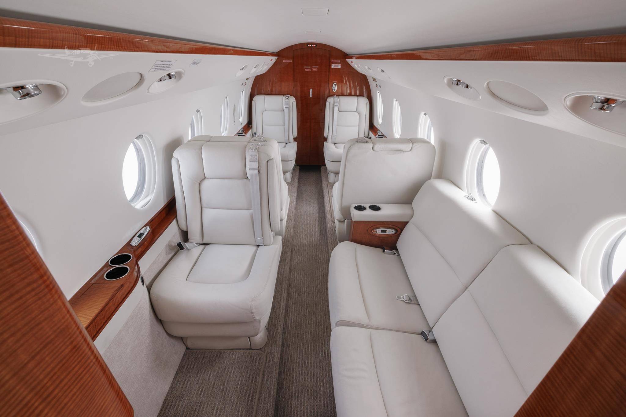 По своим габаритам салон G150 представляет собой золотую середину в среднем же классе: не самый маленький и не самый большой, высотой 175 см, он позволяет среднестатистическому взрослому стоять в полный рост. Салон может вмещать от шести до восьми пассажирских кресел в зависимости от конфигурации. Овальные иллюминаторы не такие большие, как на остальных джетах Gulfstream, но больше, чем у конкурентов, и выдают в нем принадлежность к этой марке. Бортовая кухня оборудована всем необходимым для хранения продуктов и приготовления пищи.