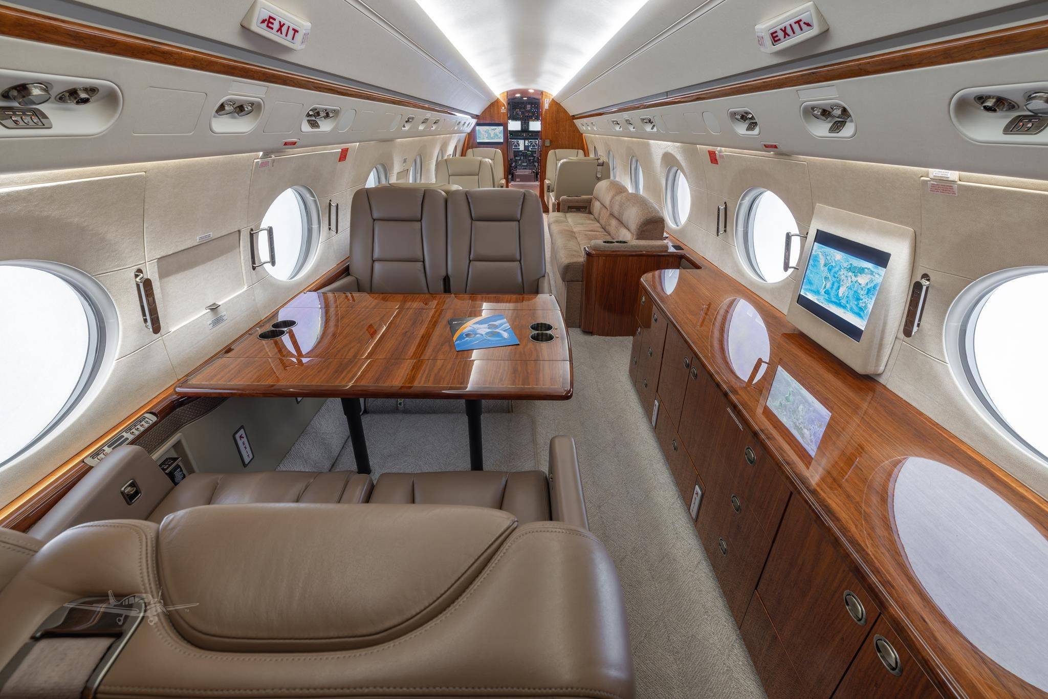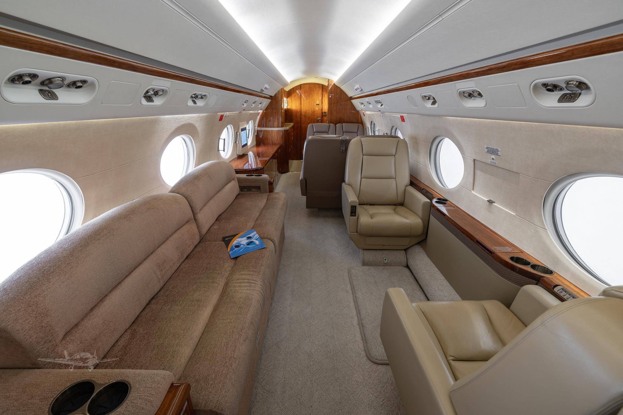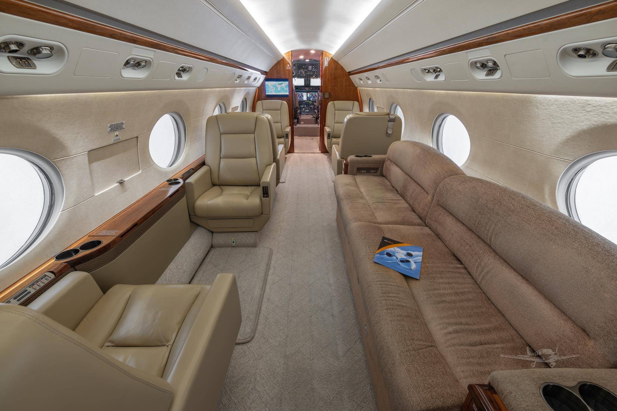Стандартные компоновки G450 рассчитаны на размещение 12– 16 пассажиров. Салон разделен на три зоны, микроклимат в которых регулируется индивидуально. Высокий потолок и большое расстояние между креслами позволяют пассажирам передвигаться во время полета и чувствовать себя свободно. Шесть больших иллюминаторов — визитная карточка G450. Они визуально расширяют салон, делают его светлым и просторным, а также открывают взору восхитительные виды. Опциональный интерьер Elite невероятно стильный и свежий с точки зрения дизайна. В набор входят опциональные кресла с электроприводом и функцией массажа, управление настройками салона со смартфона и дополнительное оборудование системой развлечений.