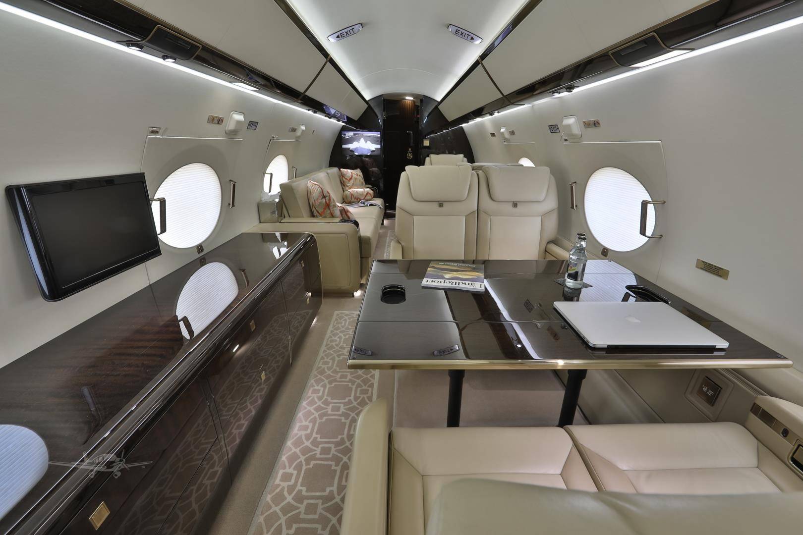 Стандартные компоновки G450 рассчитаны на размещение 12– 16 пассажиров. Салон разделен на три зоны, микроклимат в которых регулируется индивидуально. Высокий потолок и большое расстояние между креслами позволяют пассажирам передвигаться во время полета и чувствовать себя свободно. Шесть больших иллюминаторов — визитная карточка G450. Они визуально расширяют салон, делают его светлым и просторным, а также открывают взору восхитительные виды. Опциональный интерьер Elite невероятно стильный и свежий с точки зрения дизайна. В набор входят опциональные кресла с электроприводом и функцией массажа, управление настройками салона со смартфона и дополнительное оборудование системой развлечений.