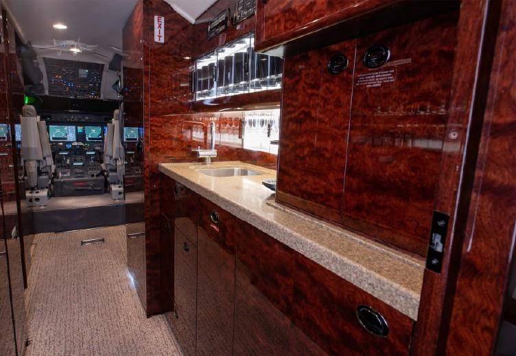 Салон оптимален для длительных перелетов. В полный рост в нем могут стоять пассажиры почти любого роста. Дополнительное ощущение простора (хотя фюзеляж значительно уже, чем у Global 6000) создают огромные овальные иллюминаторы — визитная карточка Gulfstream.
