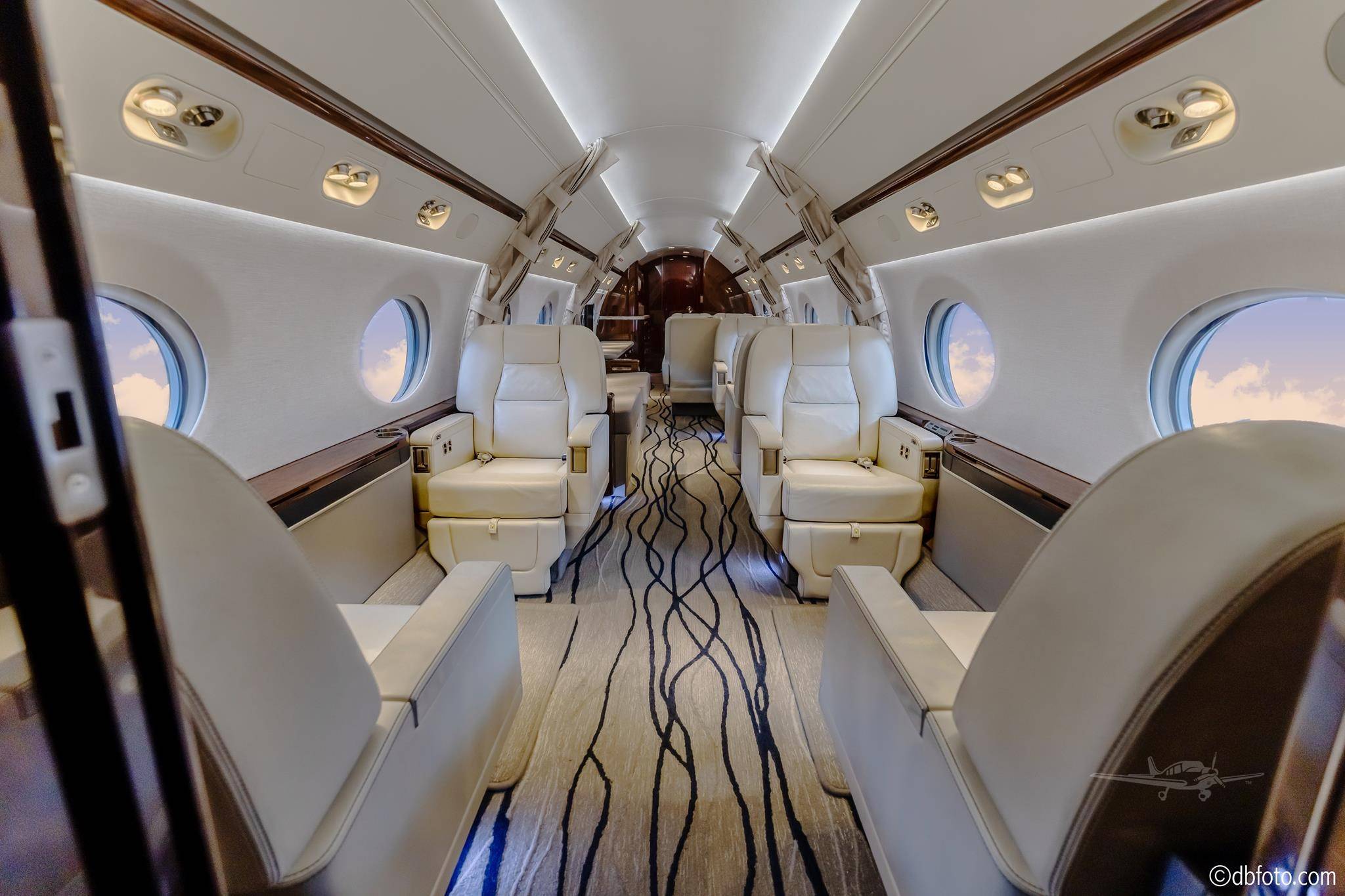 Салон оптимален для длительных перелетов. В полный рост в нем могут стоять пассажиры почти любого роста. Дополнительное ощущение простора (хотя фюзеляж значительно уже, чем у Global 6000) создают огромные овальные иллюминаторы — визитная карточка Gulfstream.