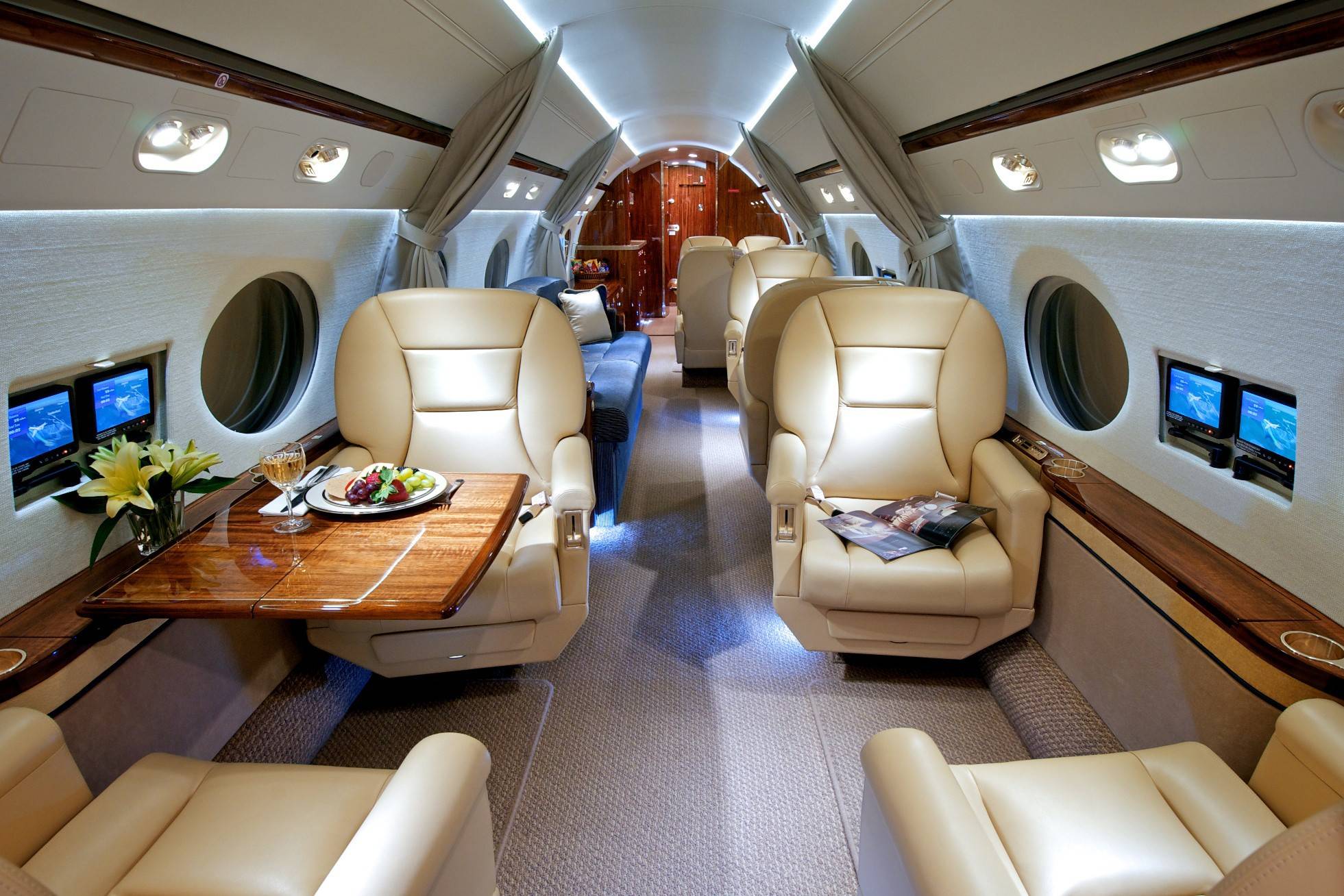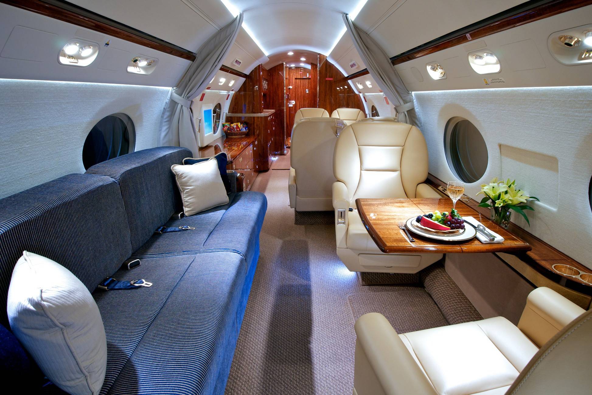 Салон оптимален для длительных перелетов. В полный рост в нем могут стоять пассажиры почти любого роста. Дополнительное ощущение простора (хотя фюзеляж значительно уже, чем у Global 6000) создают огромные овальные иллюминаторы — визитная карточка Gulfstream.