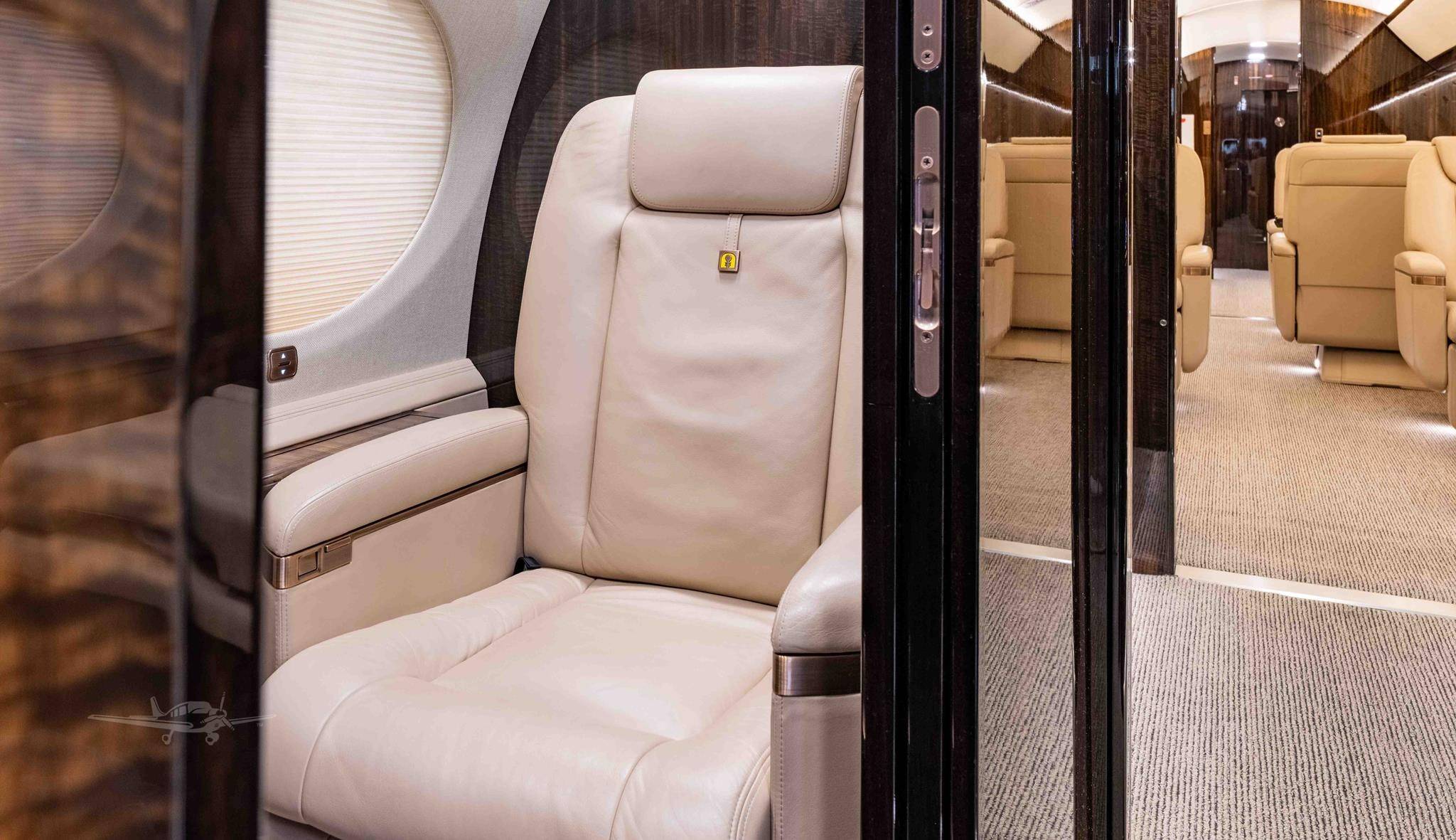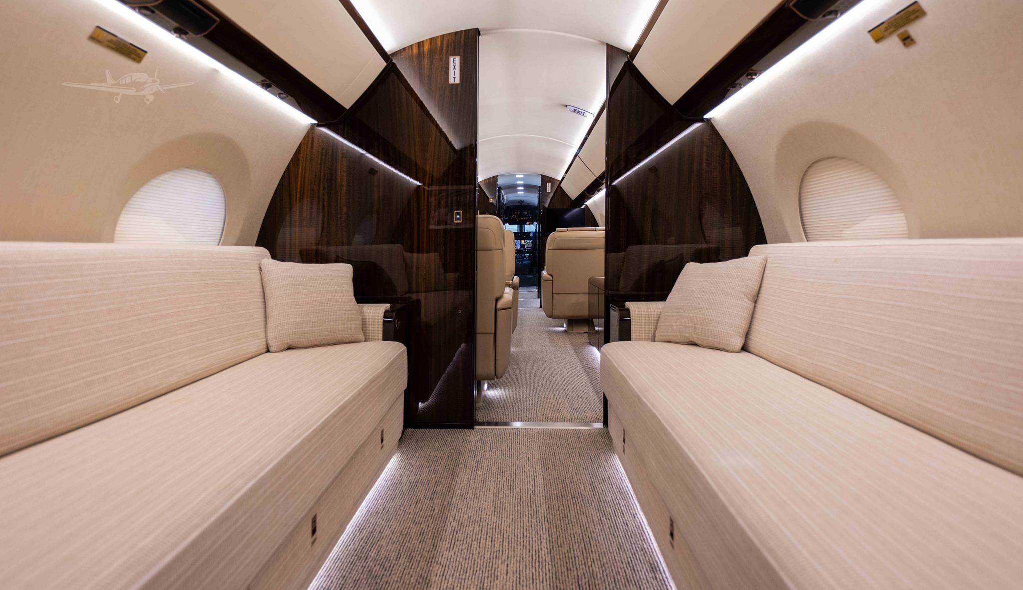 Сам же салон стал самым просторным среди традиционных бизнес-джетов, а увеличенные относительно G550 иллюминаторы (и без того огромные) создают незабываемую атмосферу в полете. Даже на просторной кухне, оборудованной всем необходимым для приготовления изысканных блюд, есть иллюминатор.