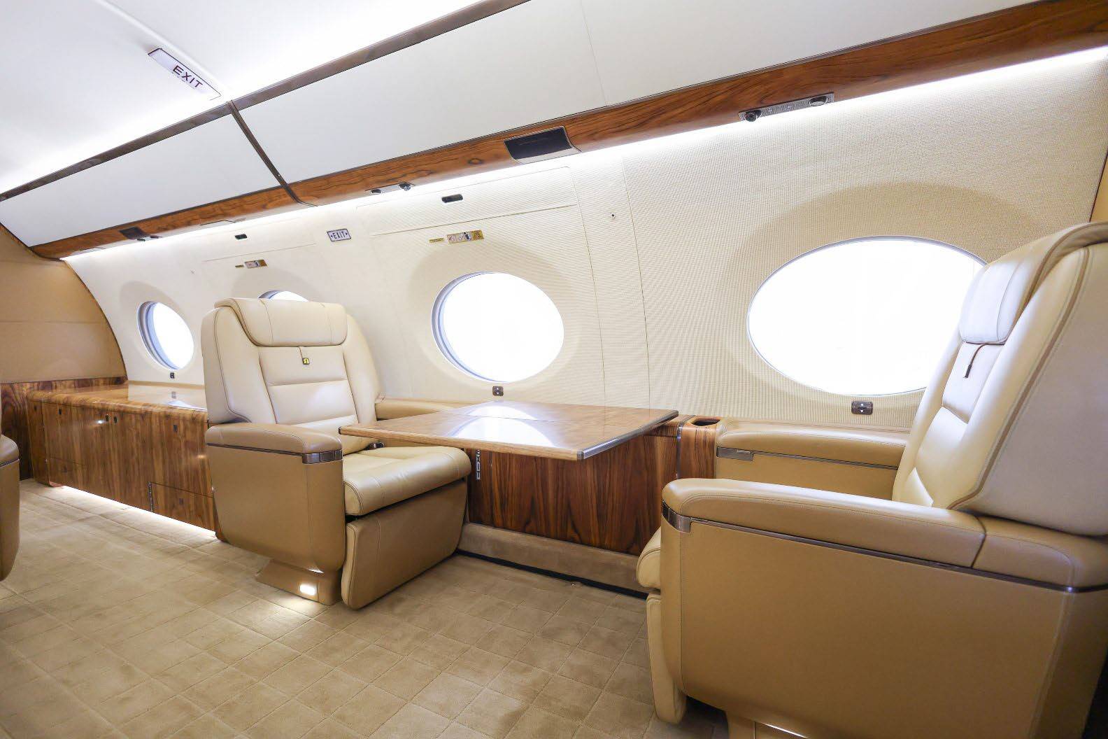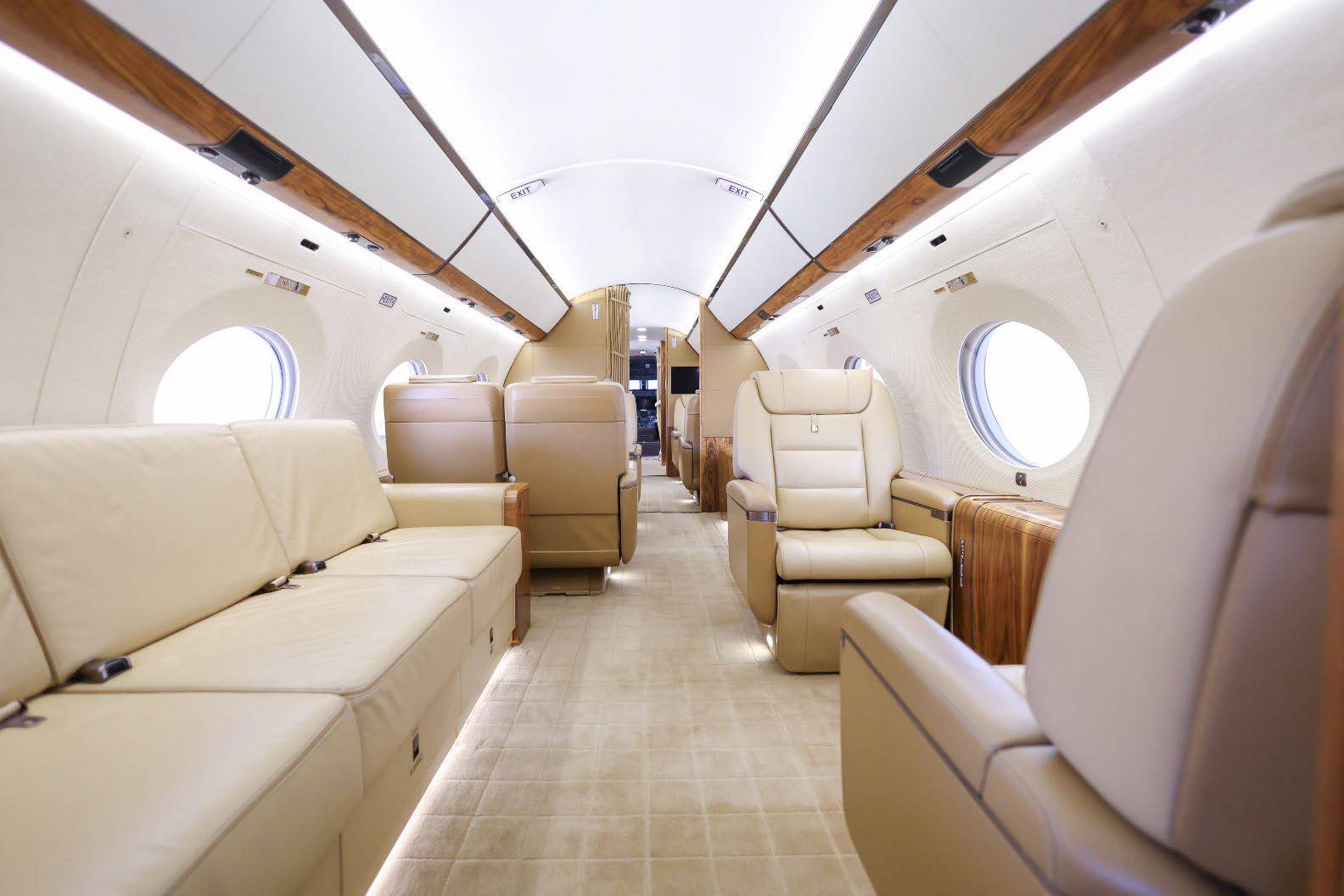 Сам же салон стал самым просторным среди традиционных бизнес-джетов, а увеличенные относительно G550 иллюминаторы (и без того огромные) создают незабываемую атмосферу в полете. Даже на просторной кухне, оборудованной всем необходимым для приготовления изысканных блюд, есть иллюминатор.