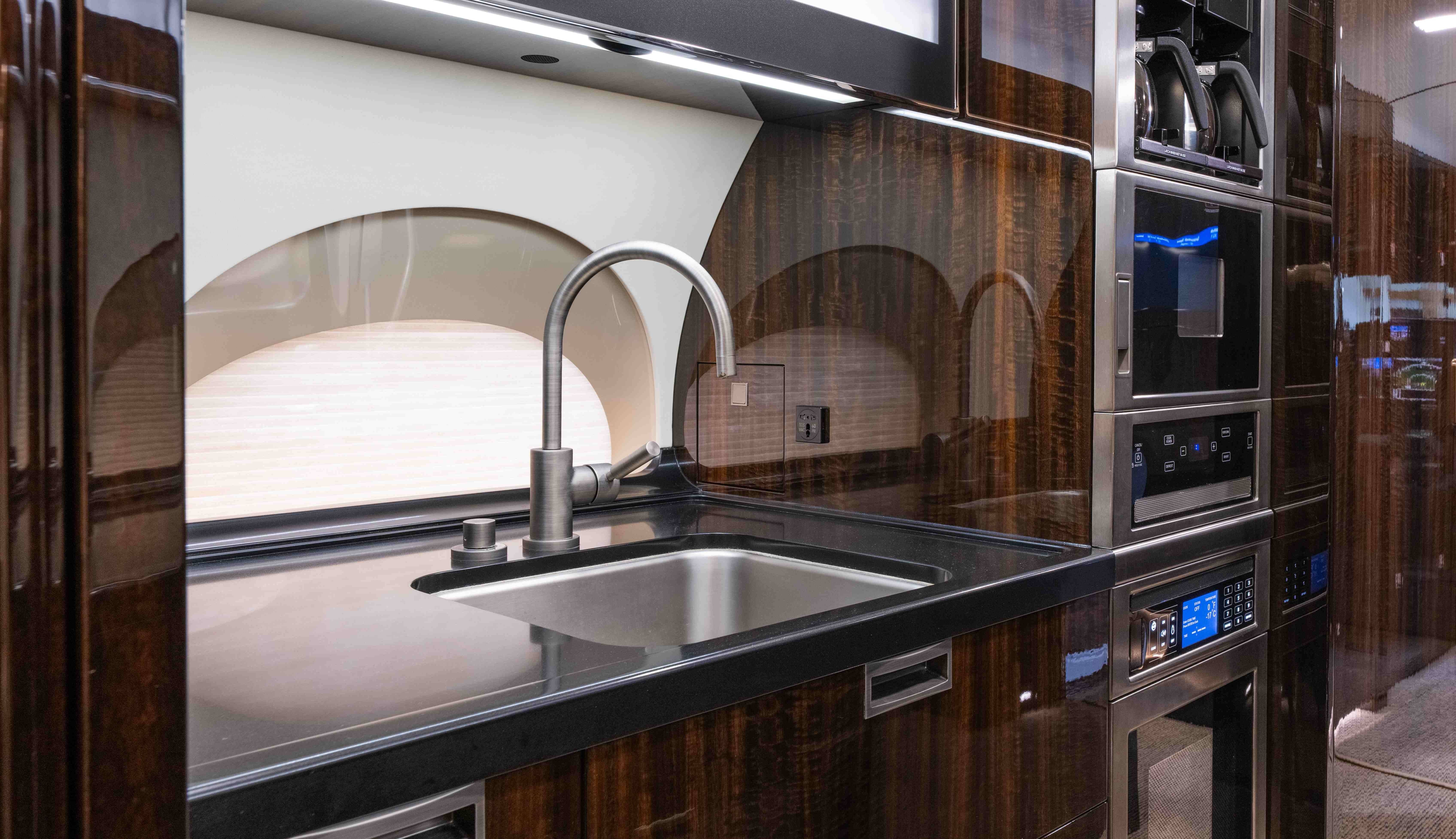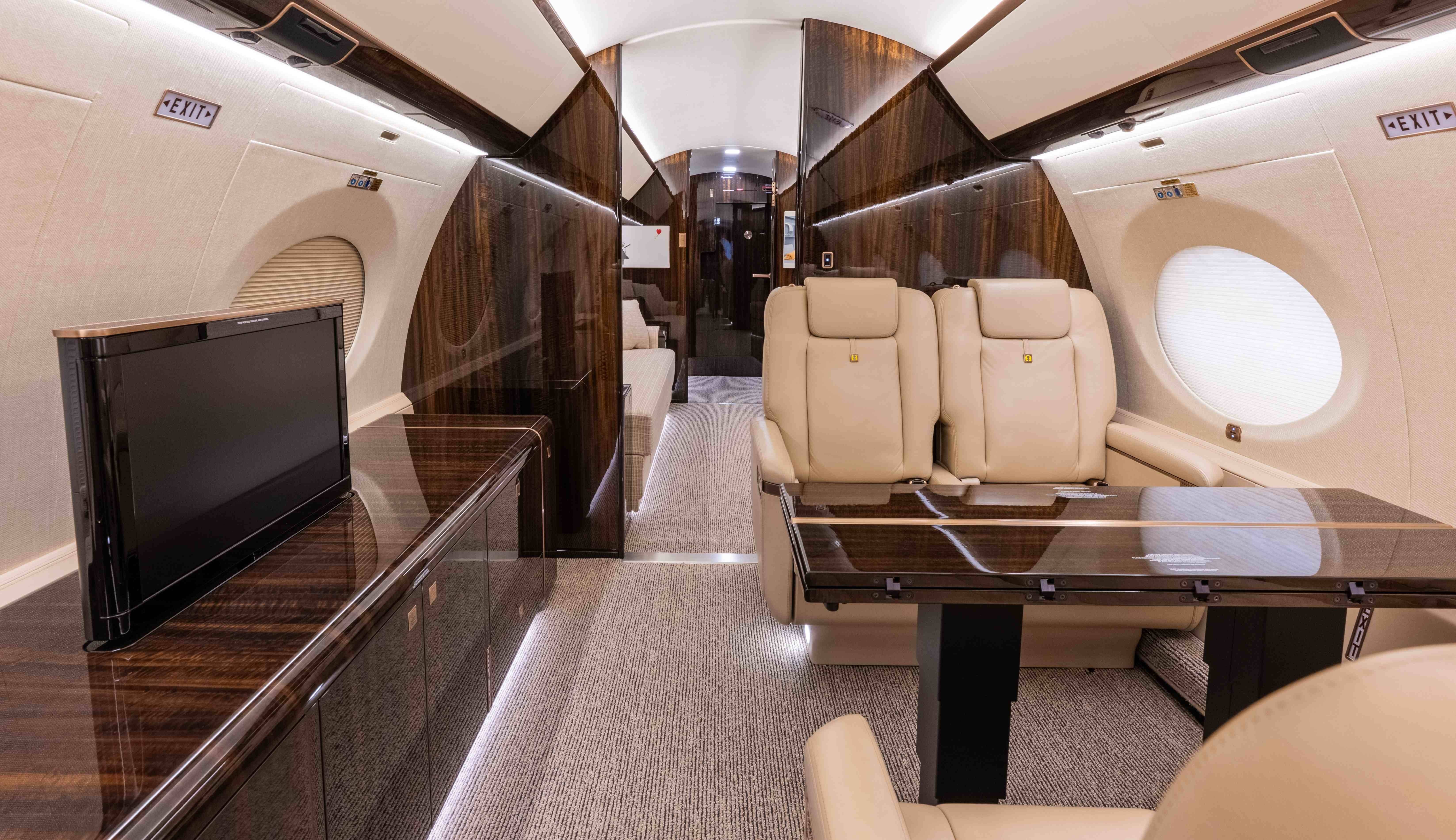 Сам же салон стал самым просторным среди традиционных бизнес-джетов, а увеличенные относительно G550 иллюминаторы (и без того огромные) создают незабываемую атмосферу в полете. Даже на просторной кухне, оборудованной всем необходимым для приготовления изысканных блюд, есть иллюминатор.