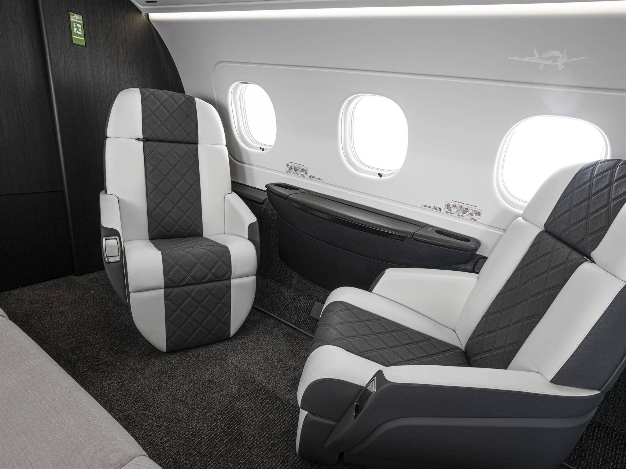 В самолете могут разместиться до 12 человек, но наиболее комфортно пассажиры будут чувствовать себя в компоновке на восемь мест. Кресла в салоне полностью раскладываются, образуя четыре полноценных спальных места. Высокий потолок (1,83 м) позволяет большинству пассажиров стоять в полный рост, а широкий проход и ровный пол удобны для перемещения.