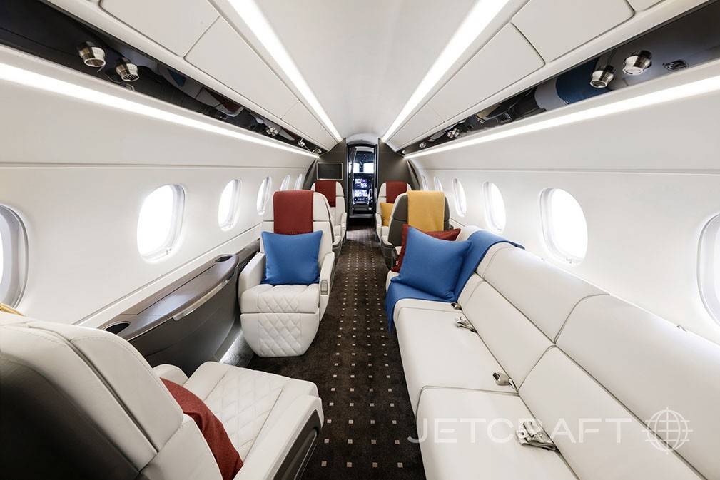 В самолете могут разместиться до 12 человек, но наиболее комфортно пассажиры будут чувствовать себя в компоновке на восемь мест. Кресла в салоне полностью раскладываются, образуя четыре полноценных спальных места. Высокий потолок (1,83 м) позволяет большинству пассажиров стоять в полный рост, а широкий проход и ровный пол удобны для перемещения.