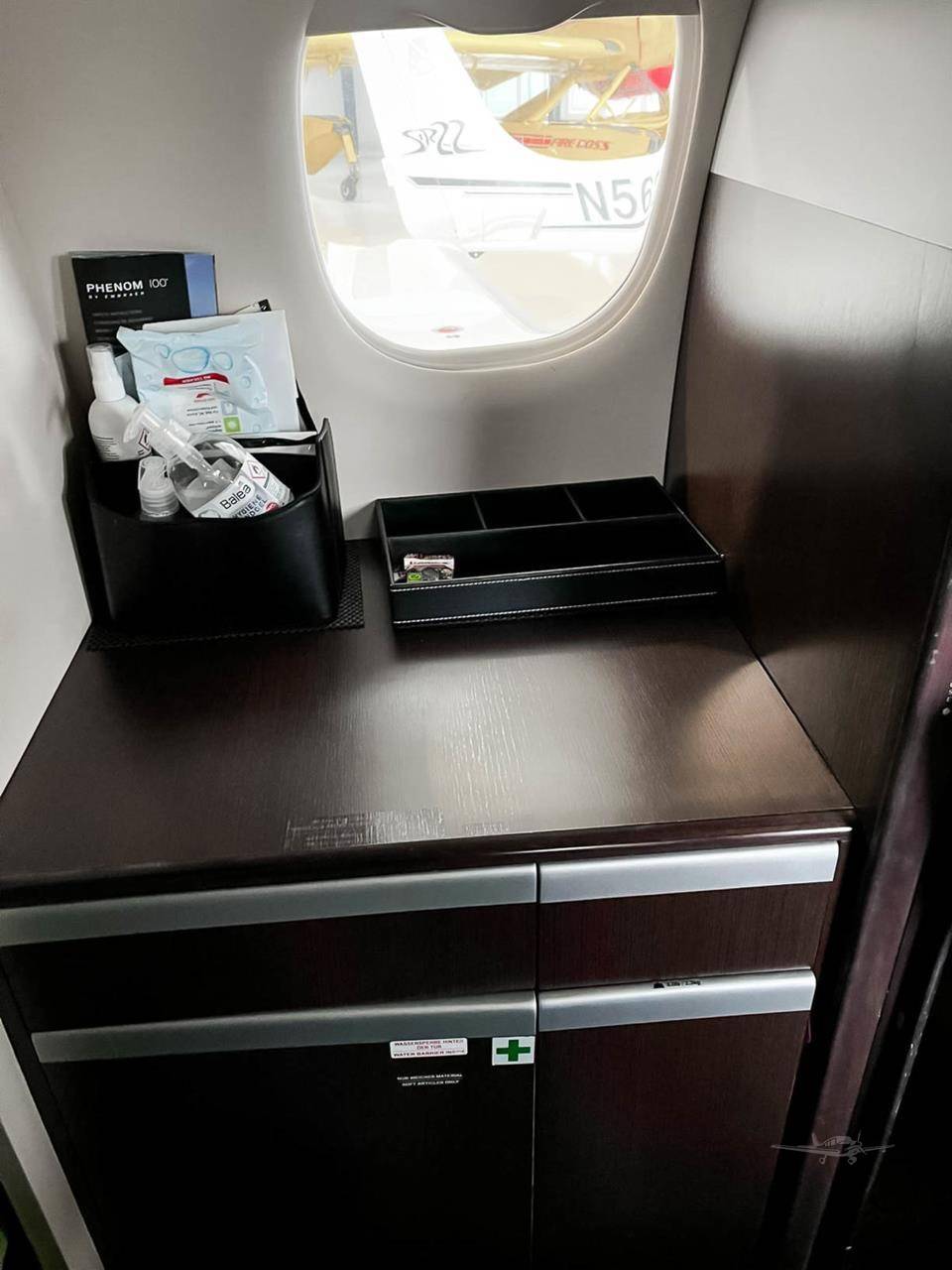 Продвигаться между креслами можно почти в полный рост, так как в полу и потолке предусмотрены ниши, увеличивающие высоту помещения. Внутренняя конфигурация имеет три варианта с кожаными креслами, каждое место оборудовано портативной ЭВМ с способностью коммуникации пассажира/пилота. Папку с бумагами, ежедневник или дамскую сумочку держать на коленях весь полёт тоже не придётся-их можно разместить в нишах корпуса, расположенных возле каждого кресла. Бортовые удобства включают центр отдыха, спутниковые коммуникации, платяной шкаф в задней части салона находиться туалетная комната. С конфигурацией, способной разместить до шести пассажиров (аэротакси), у Phenom 100 есть огромное багажное отделение вместительностью в 1.6 кубических метра, которая удобно транспортирует багаж пассажиров, сумки для гольфа, лыжи.